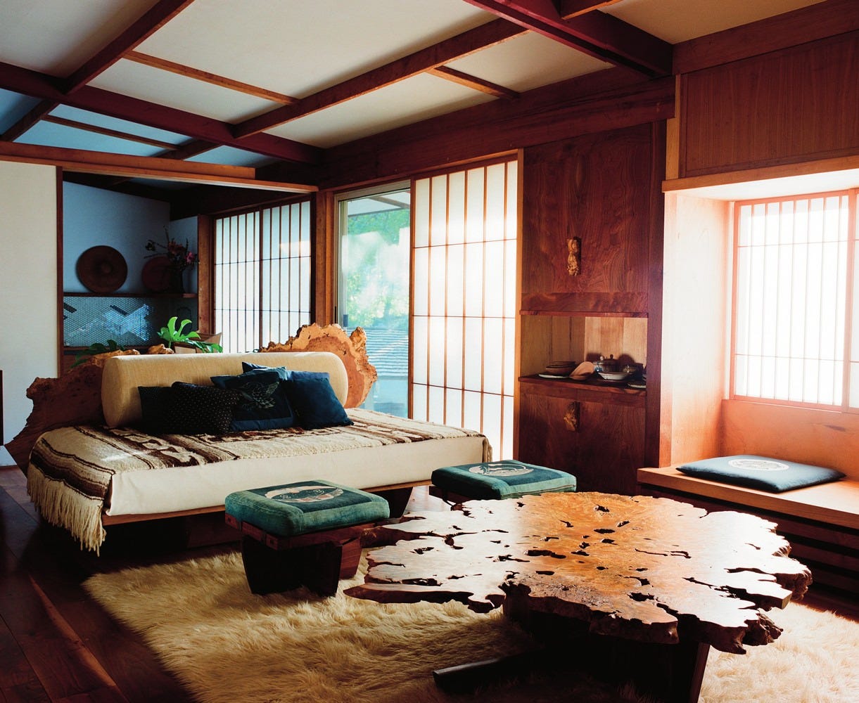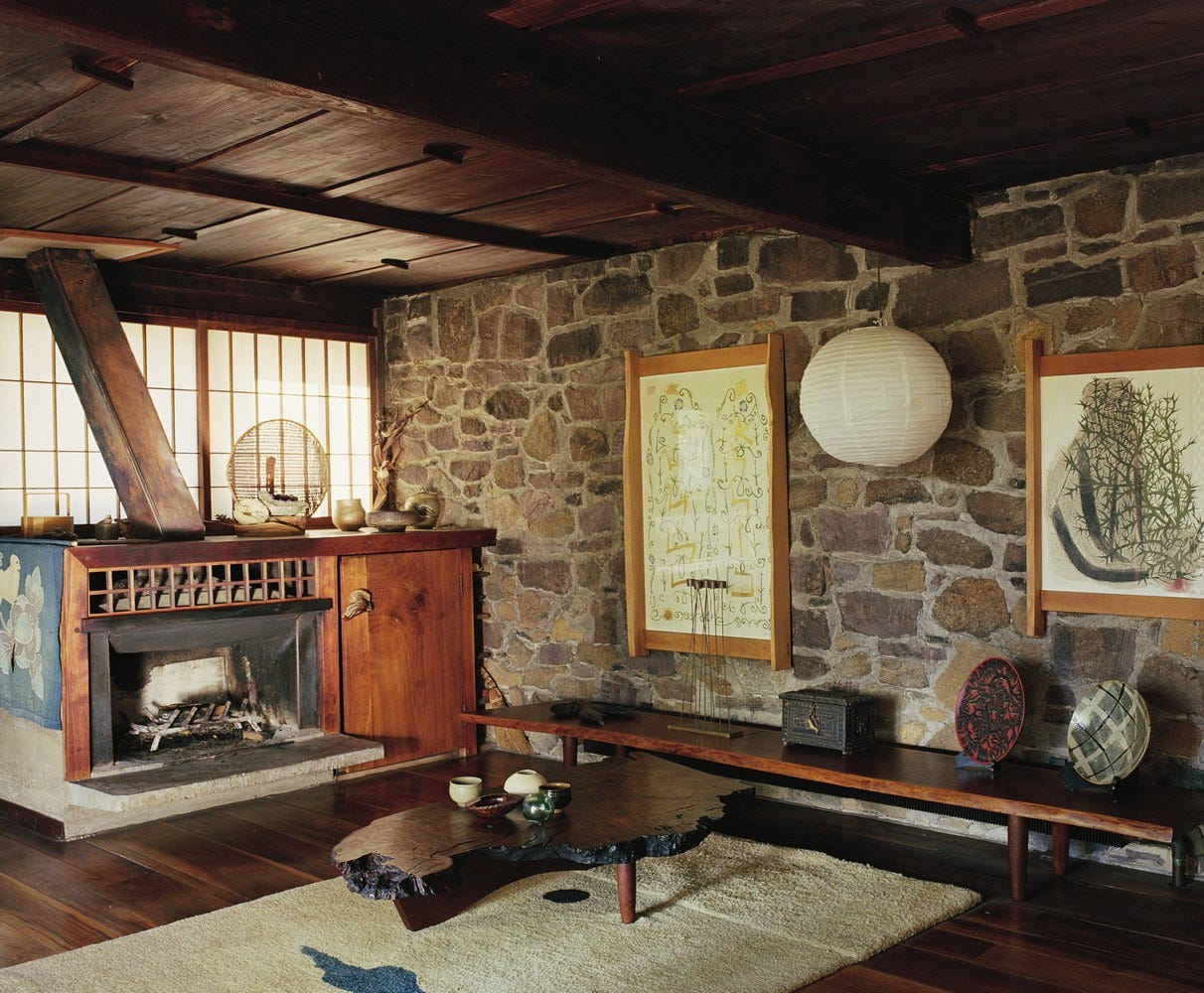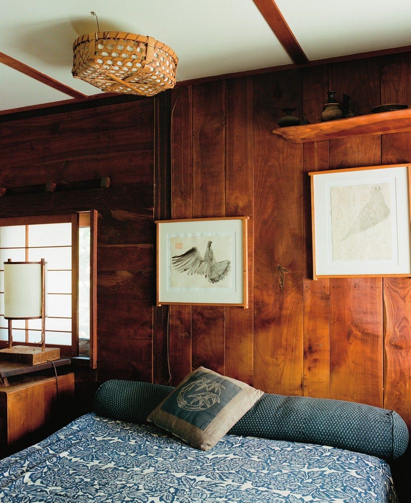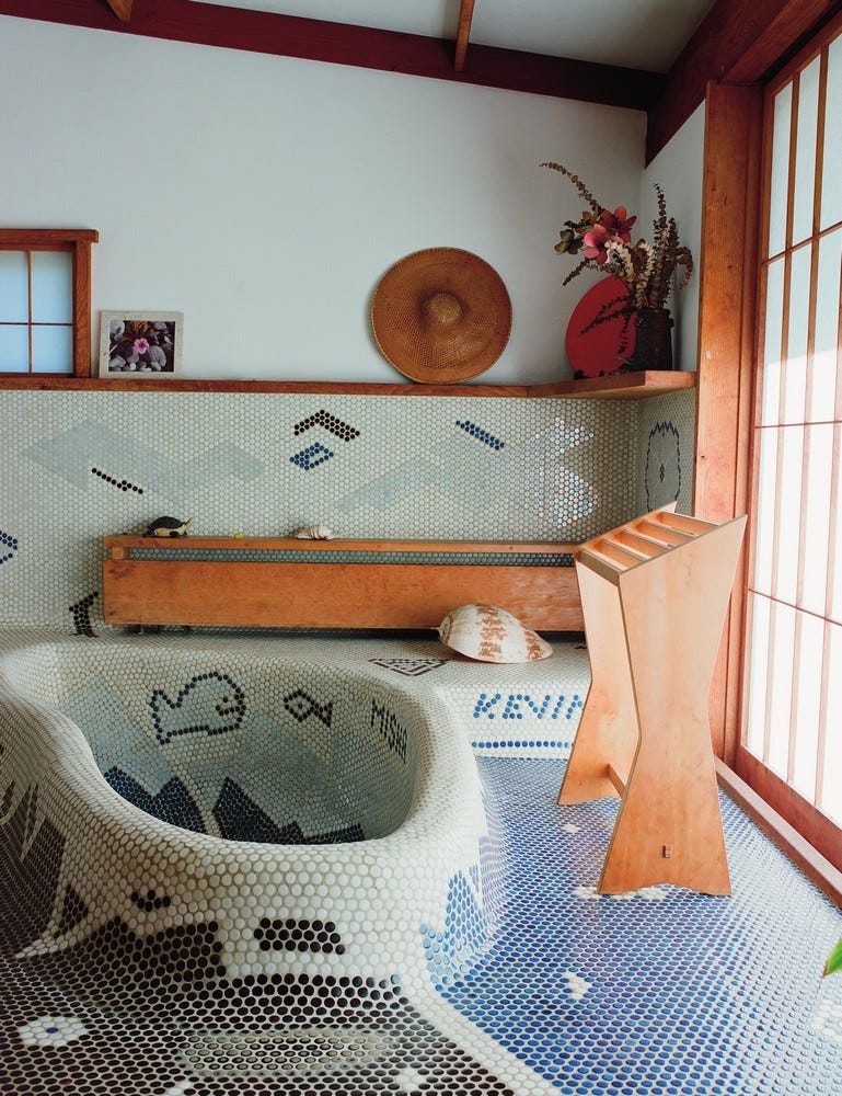 My interior tastes are certainly eclectic, and how i'm going to weave my love of Pomo, early modernism, mid century, chintz and a peaceful Japanese aesthetic into my own home is anyone's guess. This week I looked towards the honest materials, craftsmanship and calming spaces of George Nakashima for inspiration. The bathroom in his cabin proves that calm doesn't mean characterless. Embedded within the penny tiles are the name's of the designer’s grandchildren.